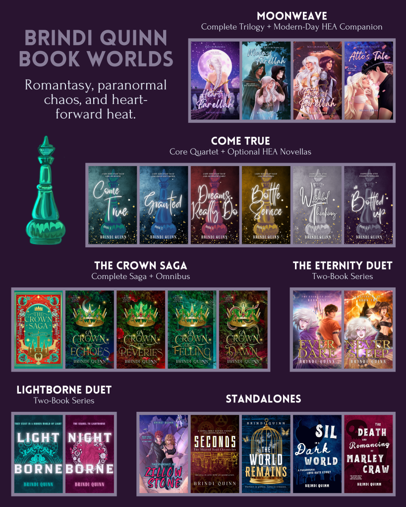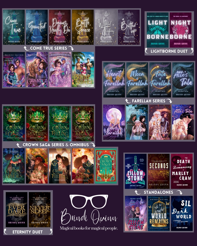 Brindi Quinn is a Minnesota-based romantasy author best known as โthe genie authorโ behind the wildly swoony Come True seriesโand for weaving sparkly worlds where romance, banter, and reluctant attraction collide. Since 2011, sheโs penned 20+ YA and NA novels that blend fantasy, paranormal, sci-fi, and comedy into page-turning mashups filled with morally gray protectors, forced proximity, and plenty of swoon.